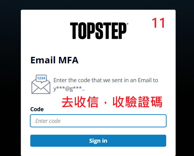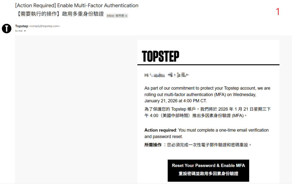 Topstep 於 2026.01.22 開始實施,登入 儀表板(Dashboard) 要雙重驗證:除了輸入密碼之外,還要在 Email 收取驗證碼。
