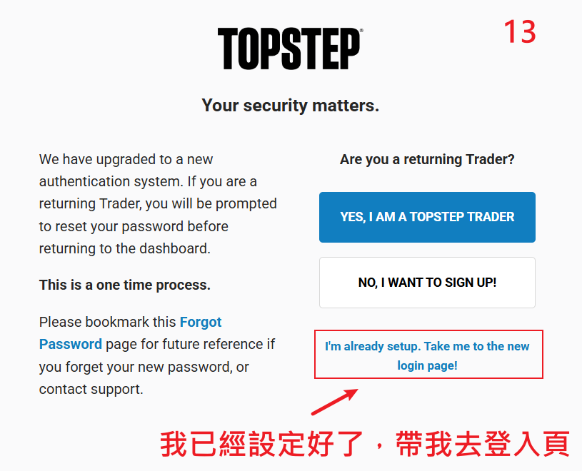 選擇下方選項:「I’m already setup. Take me to the new login page!」
